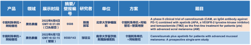 在黑色素瘤领域,j9国际站的卡瑞利珠单抗联合阿帕替尼(“双艾”组合)在2022 ASCO共入选1项口头报告和1项壁报展示。