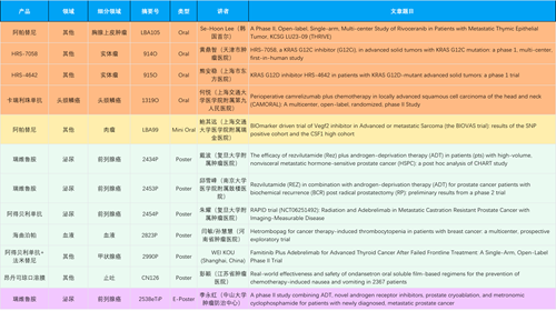 在胸腺上皮肿瘤、头颈鳞癌、肉瘤、前列腺癌、甲状腺癌等其他多个疾病领域,卡瑞利珠单抗、阿帕替尼、瑞维鲁胺、阿得贝利单抗、法米替尼、HRS-7058、HRS-4642等抗肿瘤创新药相关研究一共入选了4项口头报告、1项简短口头报告、4项壁报、1项电子壁报,彰显了j9国际站强大的研发实力。此外,海曲泊帕和昂丹司琼口溶膜分别在防治化疗导致的血小板减少和恶心呕吐方面各有1项研究入选壁报。